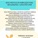 O terceiro curso oferecido pela UFPB em parceria com a PBTur é o de Boas Práticas de Fabricação para Restaurantes. Os 40 selecionados receberão noções de Boas práticas para o setor de Alimentos e Bebidas: Como proceder; O que são as Boas Práticas na Produção de Alimentos e como a qualidade na produção influencia o resultado positivo no setor; Benefícios de uma Gestão pautada nas BPFs; Manipulador de Alimentos. Contaminação dos Alimentos; Perigos; Como evitar a contaminação Cruzada. Doenças Transmitidas por Alimentos; Higienização de utensílios e instalações; Controle Integrado de vetores e Pragas; Documento; Selo Turismo Responsável. As inscrições deverão ser efetuadas entre os dias 4 a 16/10.