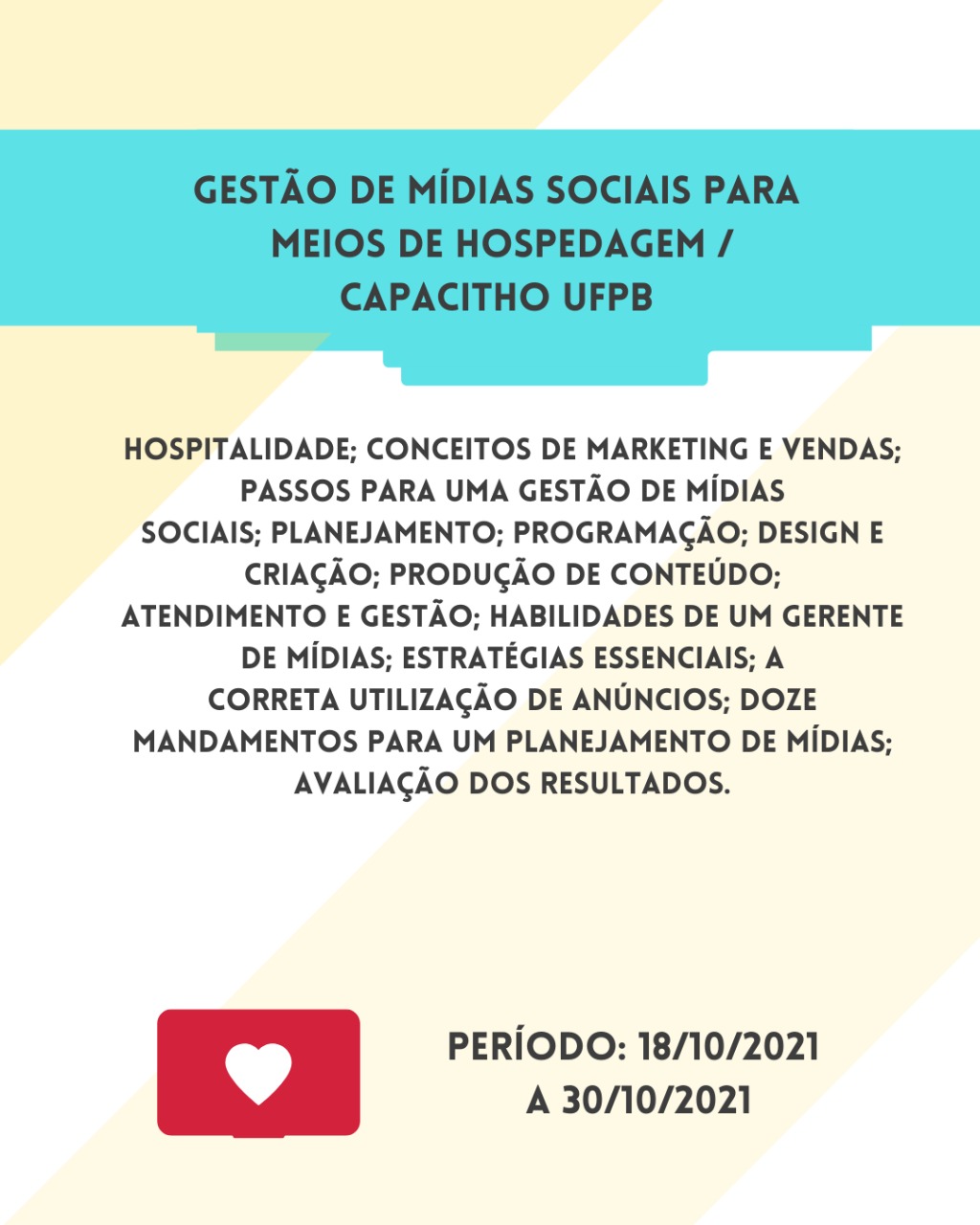 O segundo curso oferecido pelo Projeto Capacitho é o de Gestão de Mídias Sociais para Meios de Hospedagem. Durante as aulas serão abordados temas como Hospitalidade; Conceitos de Marketing e Vendas; Passos para uma Gestão de Mídias Sociais; Planejamento; Programação; Design e criação; Produção de conteúdo; Atendimento e gestão; Habilidades de um gerente de mídias; Estratégias essenciais; A correta utilização de anúncios; Doze mandamentos para um planejamento de mídias; Avaliação dos resultados. As inscrições podem ser feitas, a partir de 18 até 30/10/2021, e estão reservadas 40 vagas.