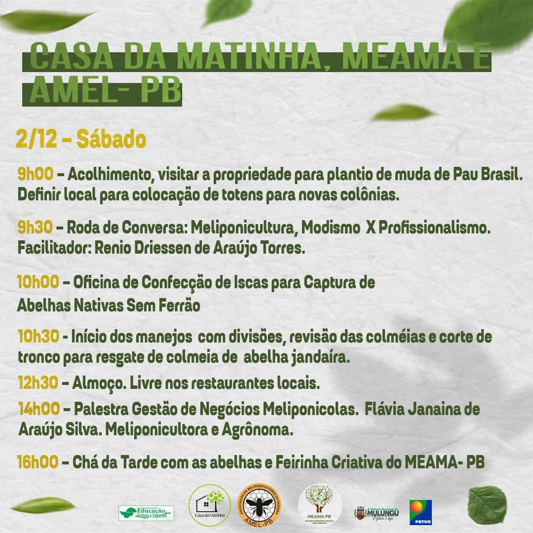 A abertura será na Casa da Matinha, a partir da 9h, onde será possível visitar a propriedade para plantio de muda de Pau Brasil. No mesmo local, acontecerá também uma roda de conversa sobre Meliponicultura, Modismo e Profissionalismo, além de oficina de confecção de iscas para captura de abelhas nativas sem ferrão, palestra sobre gestão de negócios e a Feirinha Criativa.