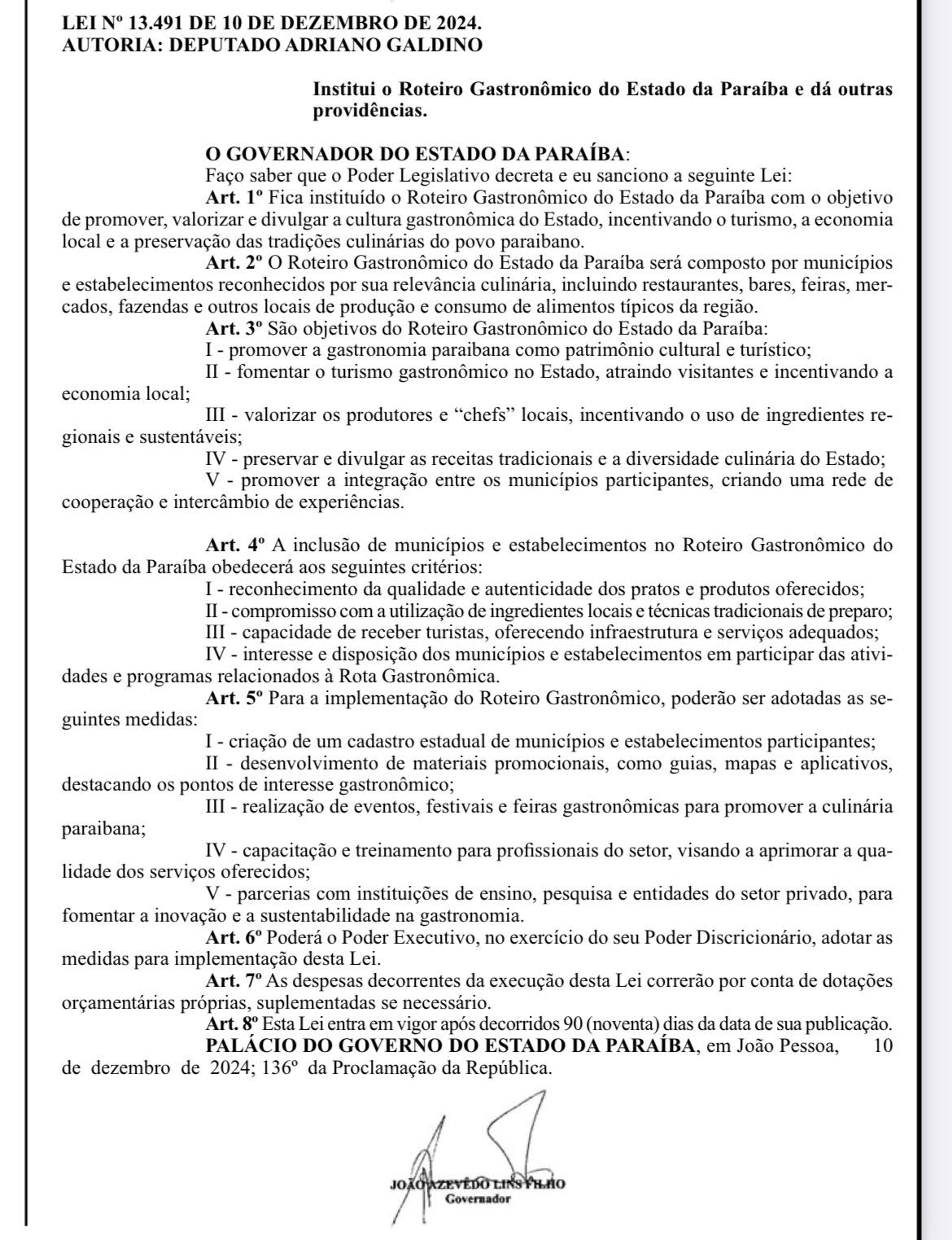 A Lei, de autoria do presidente da Assembleia Legislativa, Adriano Galdino, destaca a culinária típica da Paraíba, incluindo restaurantes, bares, feiras, mercados, fazendas e outros estabelecimentos que se destacam pela autenticidade e qualidade de seus produtos. O Roteiro Gastronômico tem como objetivo também fomentar o uso de ingredientes locais e sustentáveis, criando uma rede de turismo gastronômico integrada e sustentável.