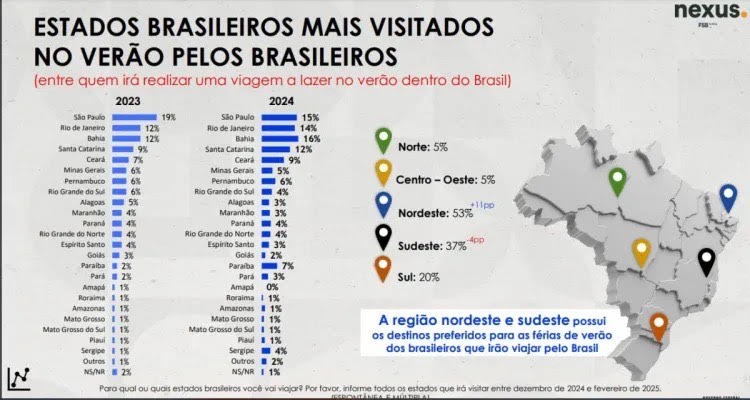 No total, 59 milhões de brasileiros estão com planos de viajar durante o verão de 2025, o que representa 35% da população brasileira. A pesquisa indica que os turistas estarão dispostos a gastar mais com suas viagens, já que o valor médio de gasto por pessoa foi estimado em R$ 2.514, uma alta de 34% em relação ao ano anterior, quando a média foi de R$ 1.877.