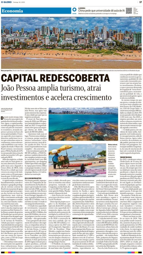 O setor de turismo da Paraíba está em evidência na mídia nacional, com uma reportagem especial publicada neste domingo (16) no jornal O Globo. A matéria, intitulada “Capital redescoberta”, aborda de forma positiva os investimentos que estão transformando o estado, com foco no Polo Turístico Cabo Branco, em João Pessoa, considerado o maior complexo hoteleiro planejado do Nordeste.