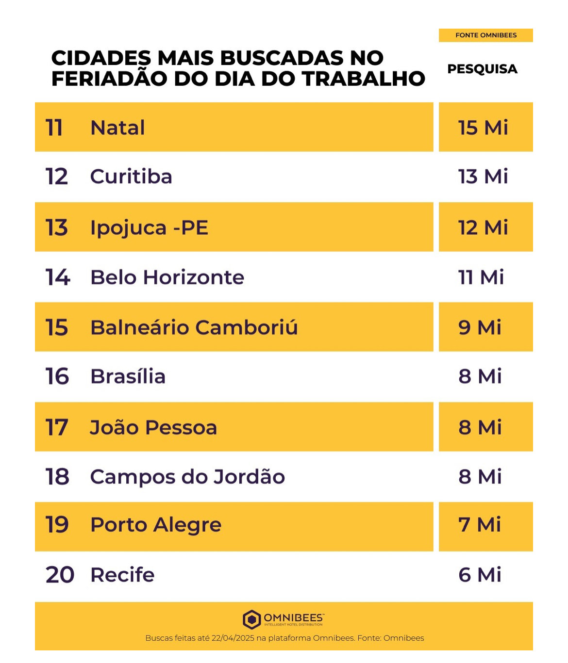 Com a proximidade do feriado do Dia do Trabalho, no dia 1º de maio, João Pessoa aparece entre os 20 destinos mais procurados pelos viajantes brasileiros, segundo levantamento da Omnibees, plataforma de distribuição inteligente voltada para o setor hoteleiro.