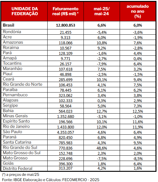 Segundo a FecomercioSP, o crescimento foi consistente e generalizado entre os estados e regiões do país, impulsionado por fatores como o feriado do Dia do Trabalhador, que estimulou o turismo de lazer, e quatro semanas completas de dias úteis, que beneficiaram o segmento corporativo.